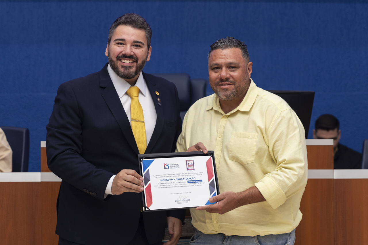 Os jornalistas Adilson Amâncio Silva e Henrique Ferian, a Loja Maçônica “João Pedro de Souza nº 6”, representada por Darci da Costa Filho, e a Banda Marcial Cristo Redentor, representada pelo maestro Luiz Carlos Relíquias, foram homenageados com Moção de Congratulação, pelos relevantes serviços prestados ao município.